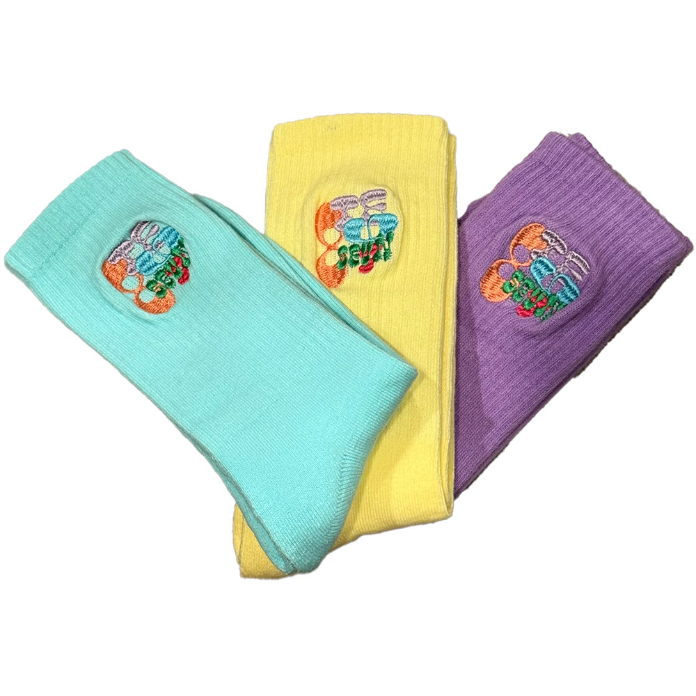 Yellow, Blue & Purple socks with multi color embroidered logo